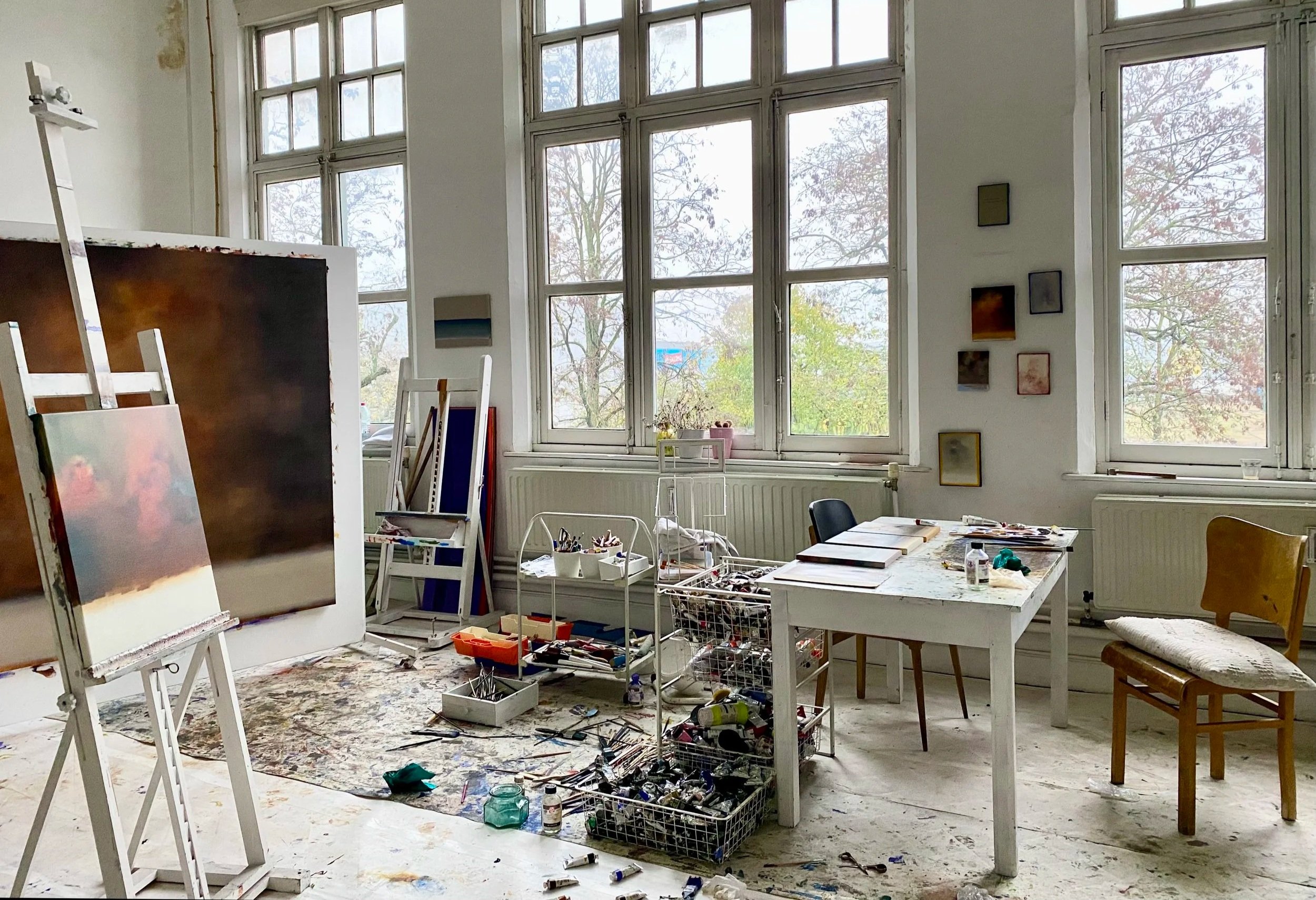 In Buit van een Strandjutter (oil on linen, 200 × 170 cm), for example, a rope composed of various interlinked colours is depicted as an artefact. In the background, blue and red tones merge into a gradient. Temporally, the scene could represent either sunrise or sunset, the ideal moment for a beachcomber to scan the tide line for natural treasures, historical objects such as coins and shards, or man made remnants like sea glass and ropes. These elements most often wash ashore after a storm, once calm has returned to the coast. Here again, a connection emerges with another recurring motif in De Witte’s work: restless, abstract cloudscapes suggesting approaching or receding storms.