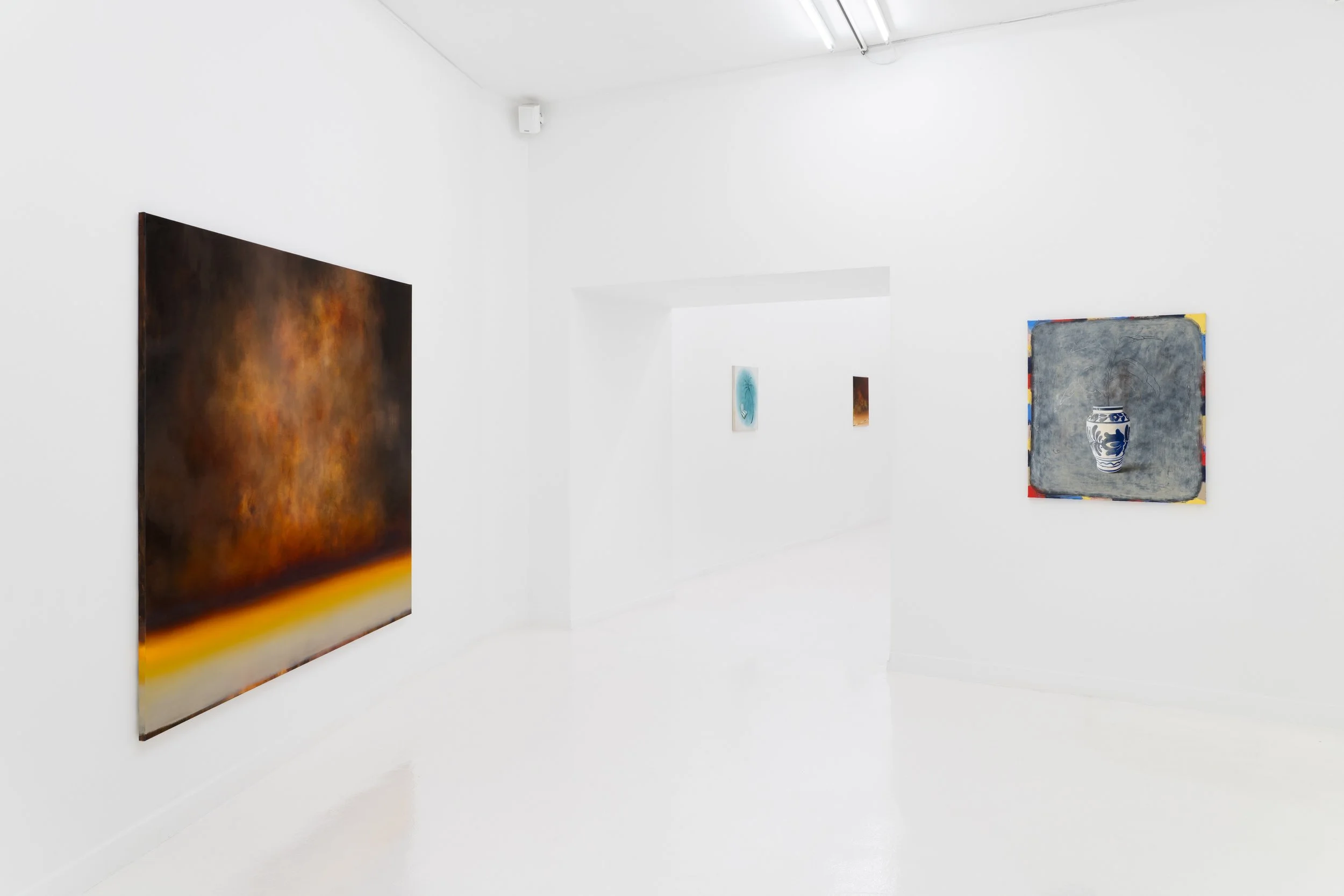 The works presented in Coup de Soleil do not depict the literal effects of sunstroke, but they do convey a sense of this disturbance. Something feels off. There is too much, too intense, or simply something that does not quite make sense. A beach parasol that no longer serves its purpose (J’ai Pensé au Parasol, oil on linen, 13 × 18 cm), a bright orange, diffuse light that nearly blinds us (Waar is mijn Zonnebril?, oil on linen, 200 × 170 cm), an inaccessible beach (Plage Sauvage I & II, oil on linen, 24 × 30 cm), or the words Merci de ne pas toucher aux œuvres (Merci, oil on linen, 13 × 18 cm).