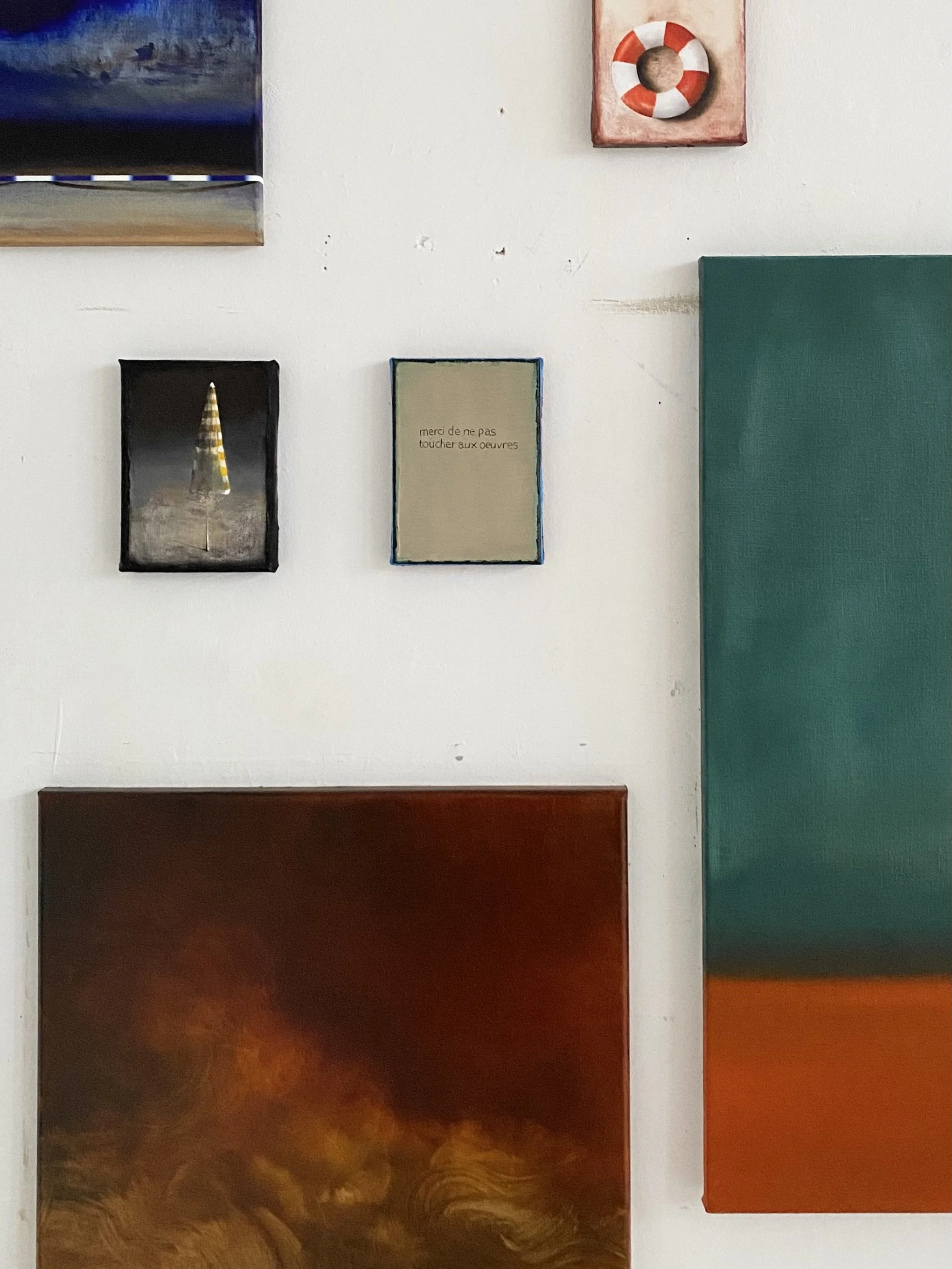 Installation view of some works in progress and two finished works ‘J’ai pensé au Parasol’ and ‘Merci’;both oil on linen, 18 x 13 cm in Adelheid De Witte’s studio in Ghent, BE.