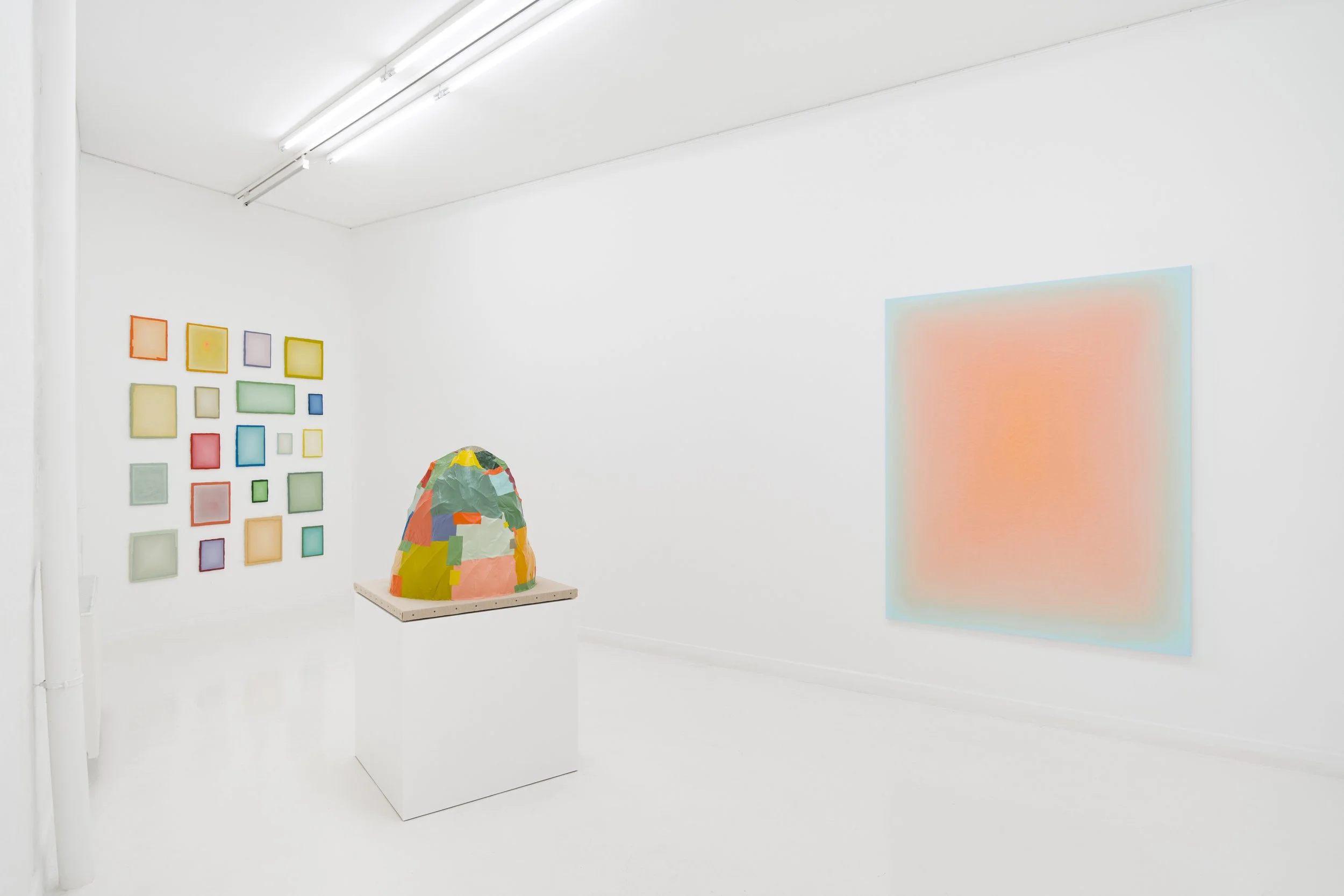 Through the distortion of the familiar phrase “Let’s play hide & seek,” a fifth element actually emerges; a hidden one (did you catch it?): the playing. This notion is also an essential component of his oeuvre and refers back to a previous solo exhibition in which the concept of play was central to the show.